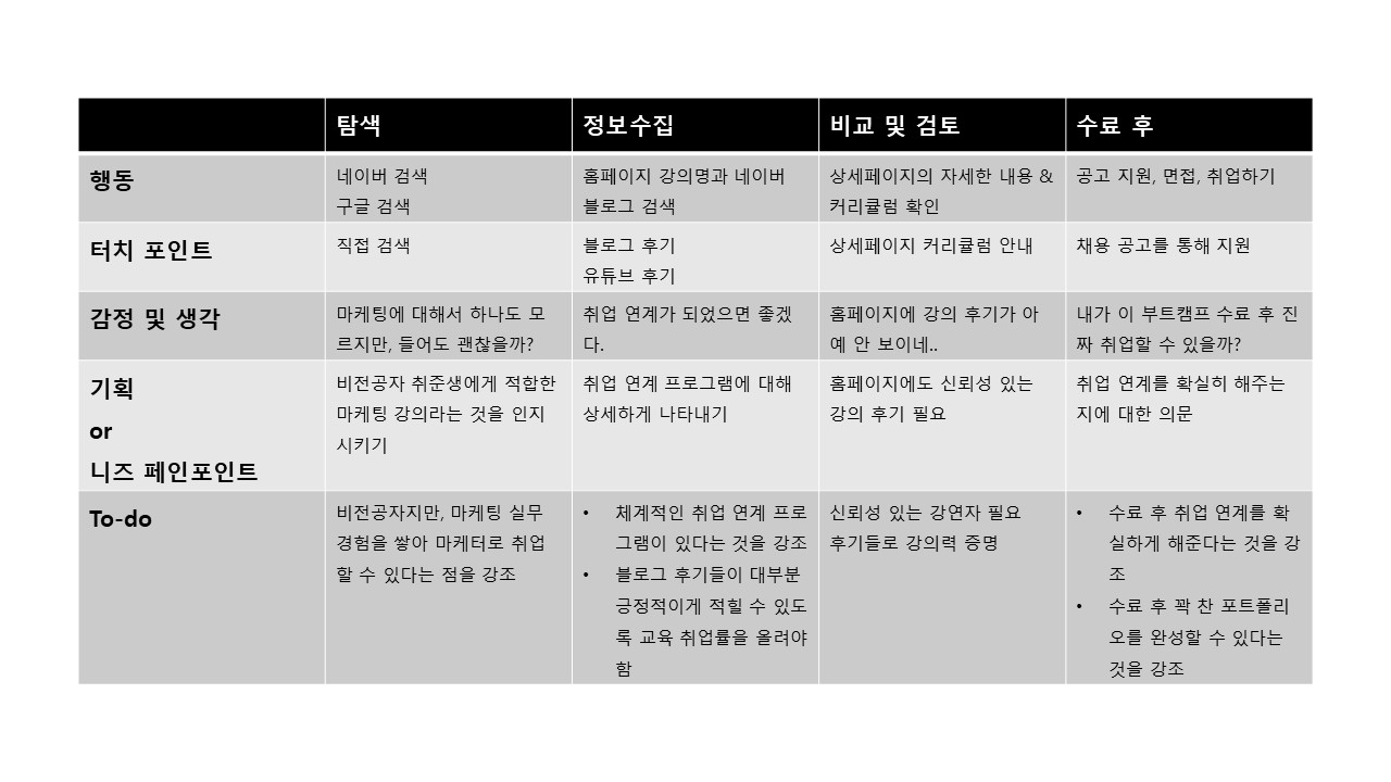 6. 참가자 A) 비전공자여서 마케터로 취업할 때 어떻게 해야 하는지 막막했다. 관련된 자격증을 딴다고 해도 취업이 당장 될 것 같지 않고 그래서 전반적으로 취업에 도움이 될만한 부트캠프를 선택하게 됐다.